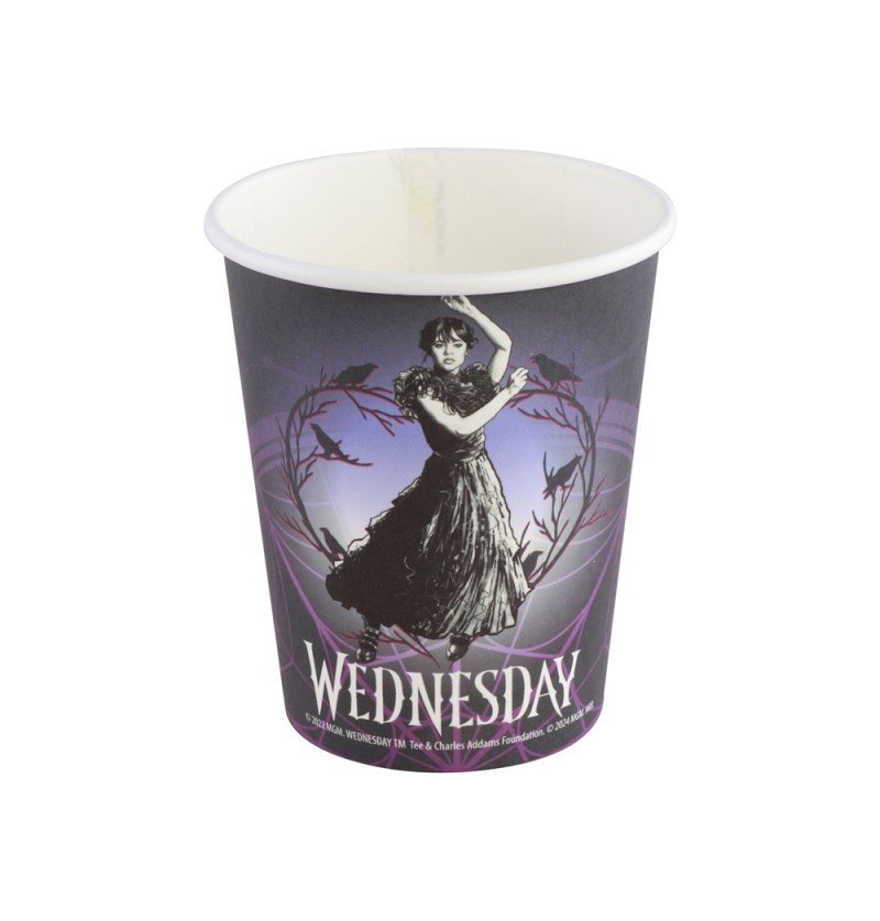 Svarte pappkrus med onsdagsmotiv - perfekt for å få den mystiske følelsen på festen! Inneholder 8 standard kopper, ca. 8 cm høye