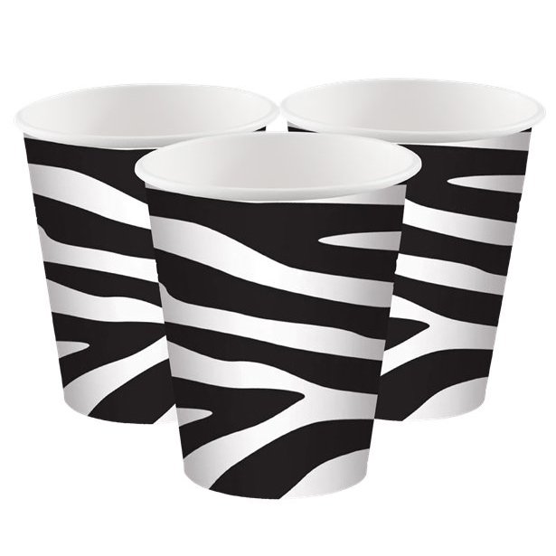 8-pakning med pappkrus med sebramønstre, så fine til en safarifest.
