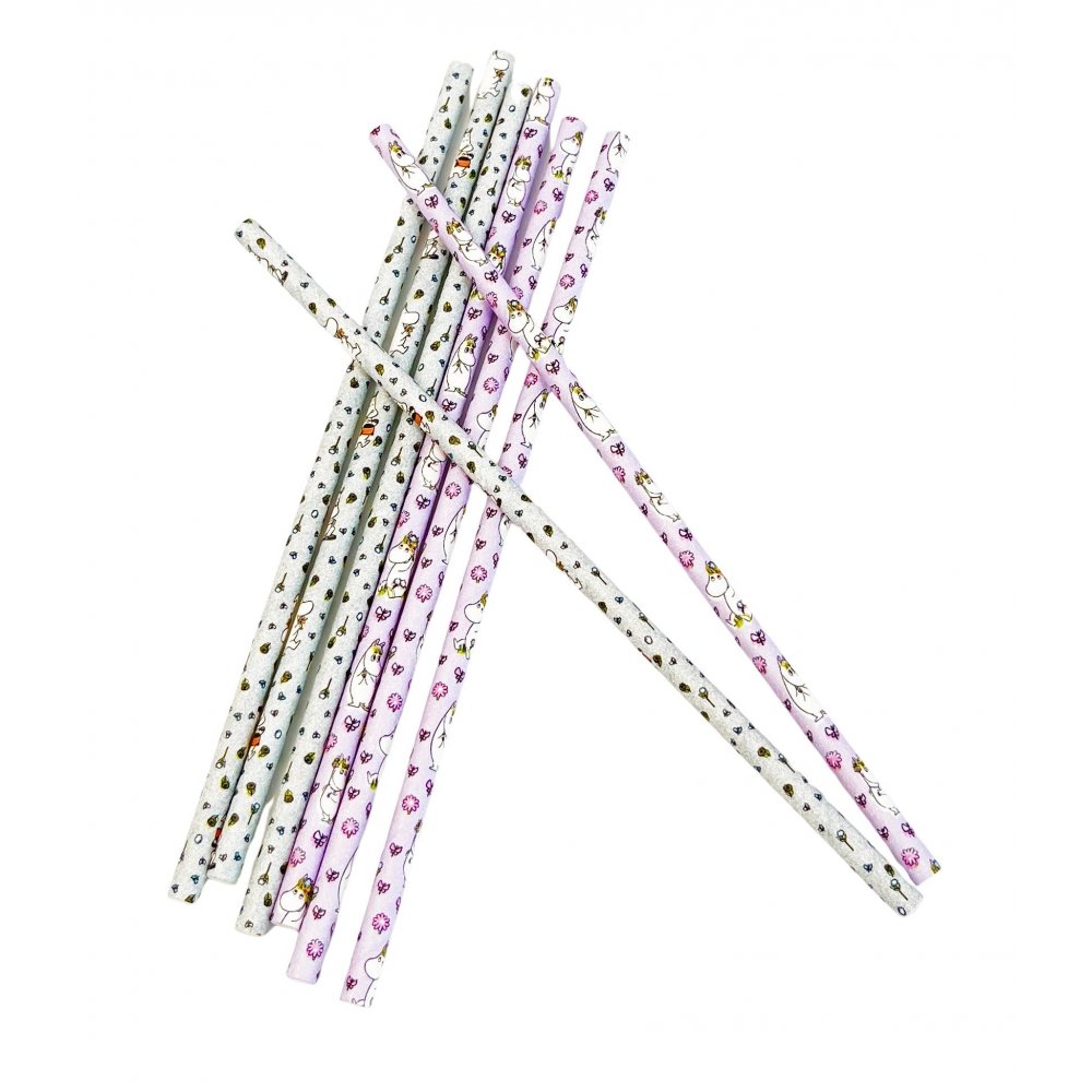 Fargerike papirsugerør med Mummi-motiver. Pakken inneholder 10 sugerør i to forskjellige design, alle med utskårne figurer av Tove Janssons elskede Mummi-figurer. Perfekt for å gjøre festen din ekstra spesiell og full av Mummi-magi.