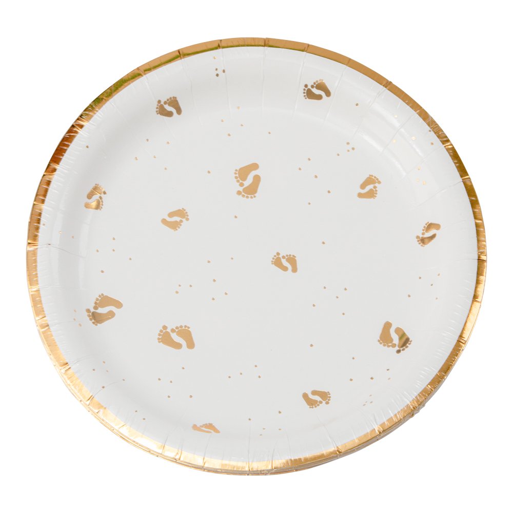 8-pakning med papptallerkener i hvitt med små babyføtter i gullmetallic.