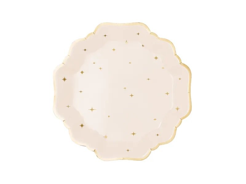 Pakke med 6 papptallerkener i beige med vakre gullstjerner. Passer til alle typer festlige anledninger.