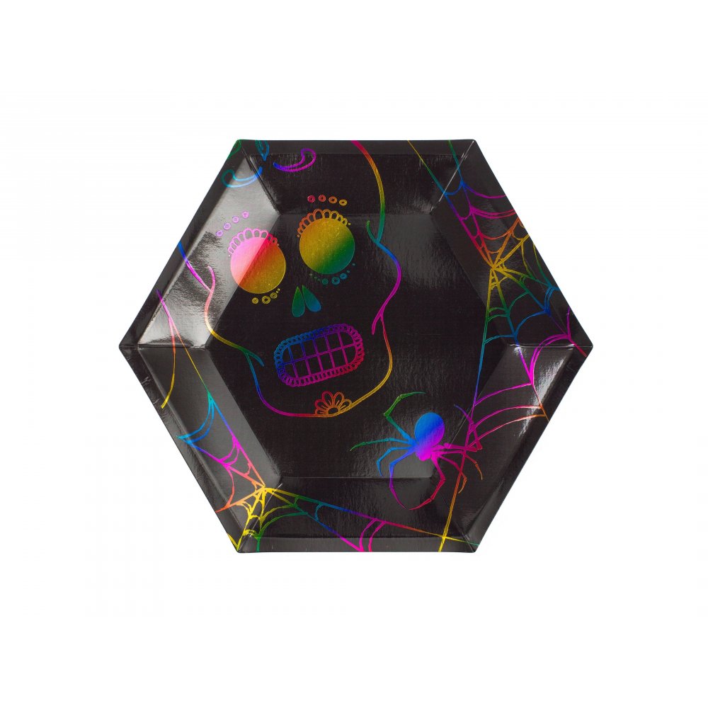 8-pakning med sekskantede papptallerkener med hodeskaller, edderkopper og mer!