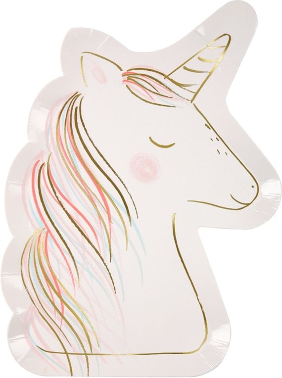 Skap en magisk atmosfære på festen med papptallerkener formet som enhjørninger med neontrykk og glitrende gulldetaljer.