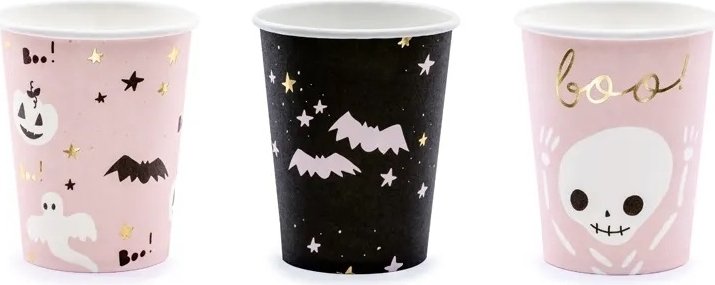 Svarte pappkrus med flaggermus i gull. Krusene rommer ca 220 ml.Antall: 6 stykker.