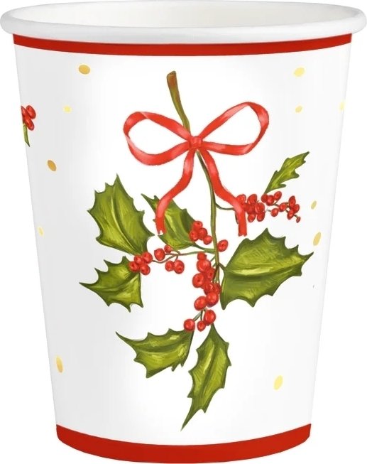 Flott pappkrus i hvitt med rød kant og teksten Merry Christmas.