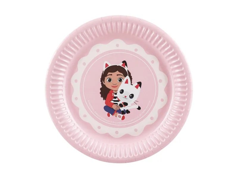 Rosa papptallerkener med motiver fra det populære Gabby's Dollhouse.