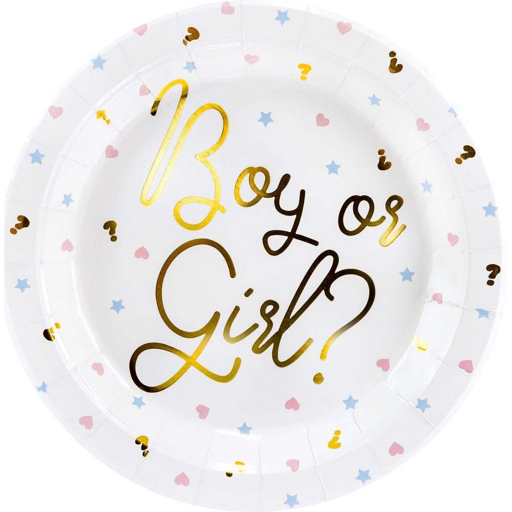 6-pakning med papptallerkener med søte detaljer i rosa og blått, teksten Gutt eller jente? i gullmetallic. Perfekt til en babyshower eller kjønnsavsløringsfest.