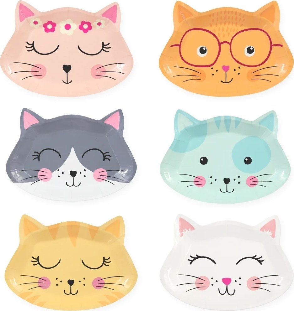 6-pakning med fine flerfargede tallerkener formet som et katteansikt. Så søt!