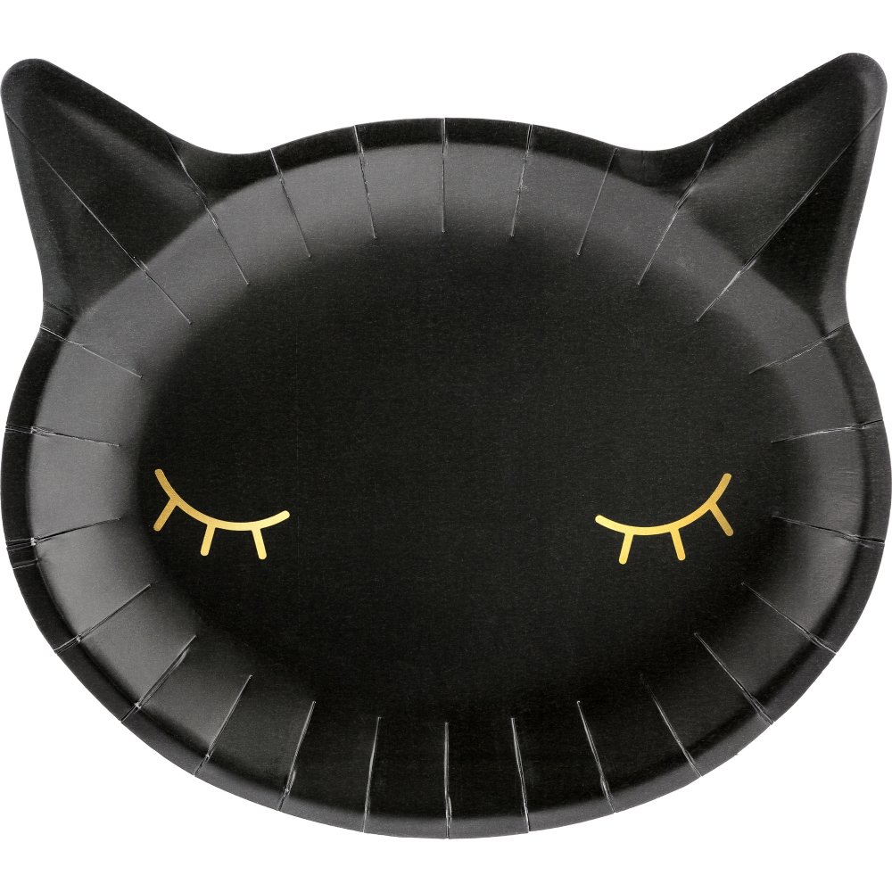 6-pakning med papptallerkener formet som en svart katt med detaljer i gullmetallic.
