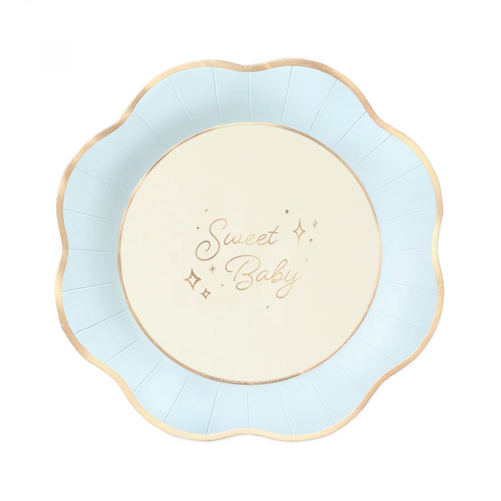 6-pakning med papptallerkener i hvitt med blått og gull metallic-trykk og teksten Sweet baby!