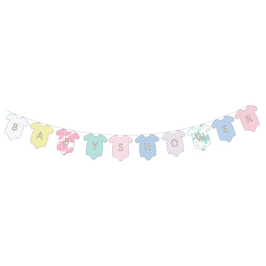 Superfin vimpel med babybodyer i pastellfarger og teksten Baby Shower