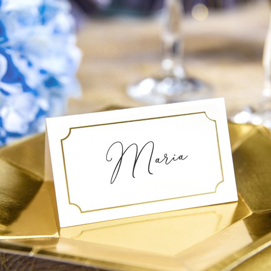 10-pakning med bordkort i hvitt med en dekorativ ramme i gullmetallic.