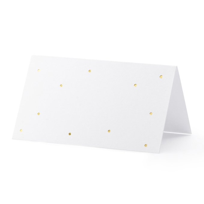 10-pakning med bordkort i hvitt med små prikker i gullmetallic.