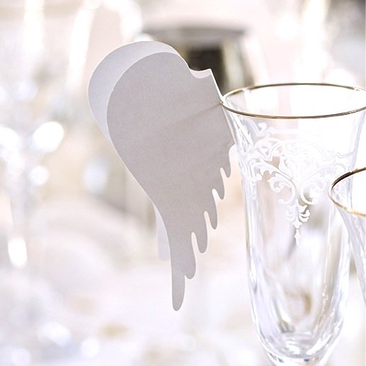 10-pakning med plasseringskort formet som hvite vinger til å sette på glass. Størrelse: 12 x 11 cm.
