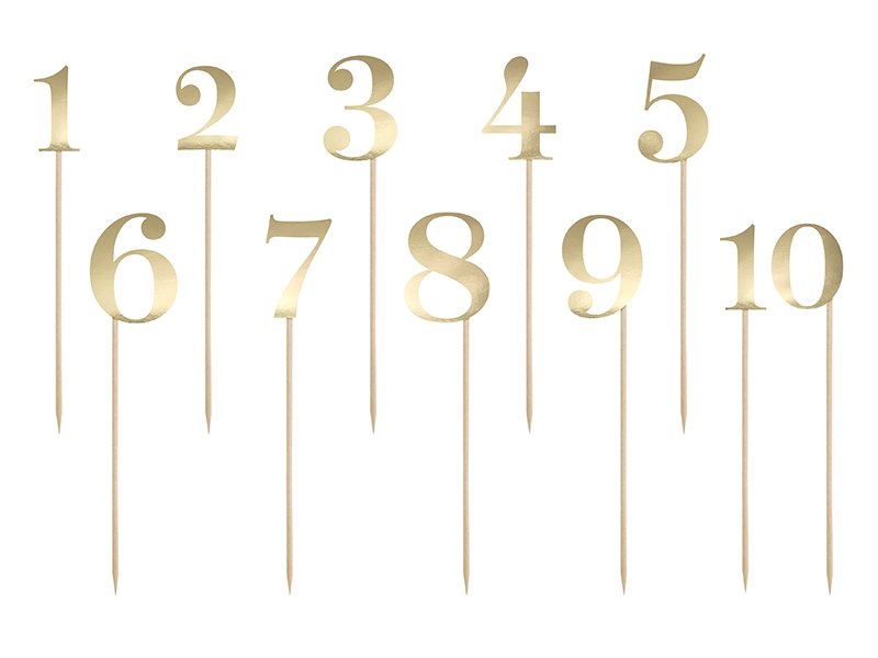 Pakke med 11 plektre med tall i gullmetallic - 1-10. Plukkene passer like godt til bursdagskaken som til nummerering av bord under bryllupsmiddagen.