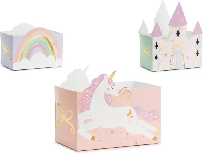 Fine popcorn- eller snackbokser laget av papir i tre forskjellige motiver: Enhjørning, Regnbue og Slott. Inneholder 6 deler, 2 av hvert motiv.