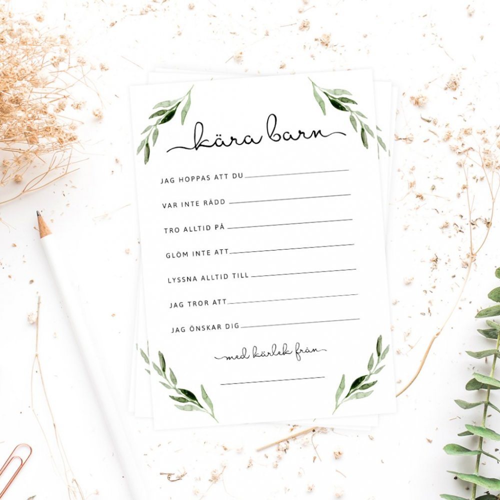 8-pakning med kort med plass til personlige ønsker til babyen.