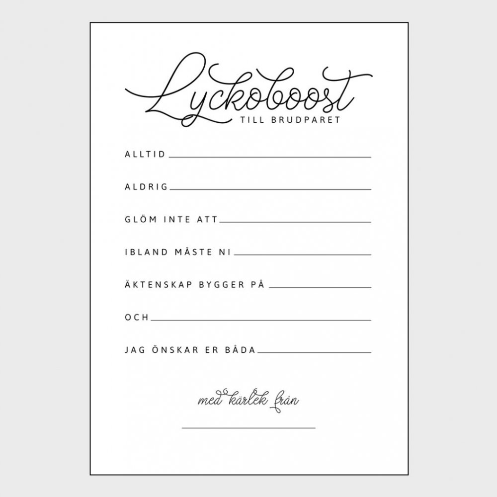 Kortene er i postkortstørrelse og har blank bakside. Fullfør opplegget med en kortboks, eller la gjestene legge kortene sine i egne konvolutter! Eller hvorfor ikke lime dem inn i gjesteboken?