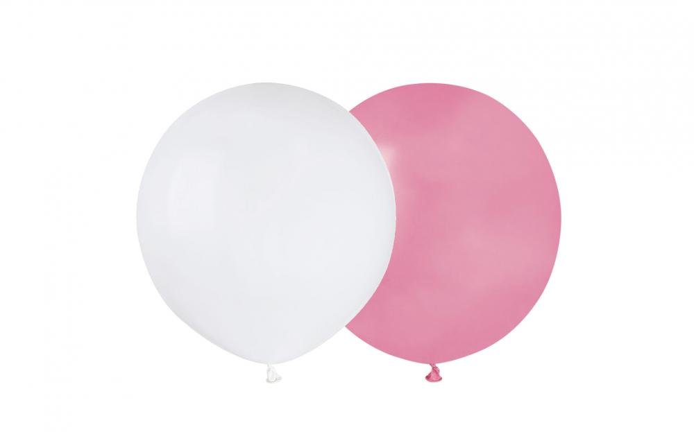 10-pakning, runde lateksballonger i hvitt og rosa. Ballongene er 48 cm i diameter når de er oppblåst, og kan fylles med luft eller helium.