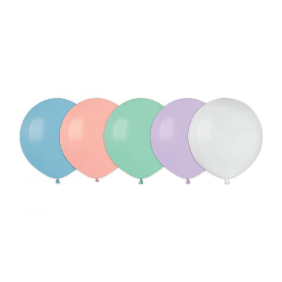 5-pakning med runde ballonger i pastellfarger - lyseblå, lys rosa, mintgrønn, lys lilla og hvit.
