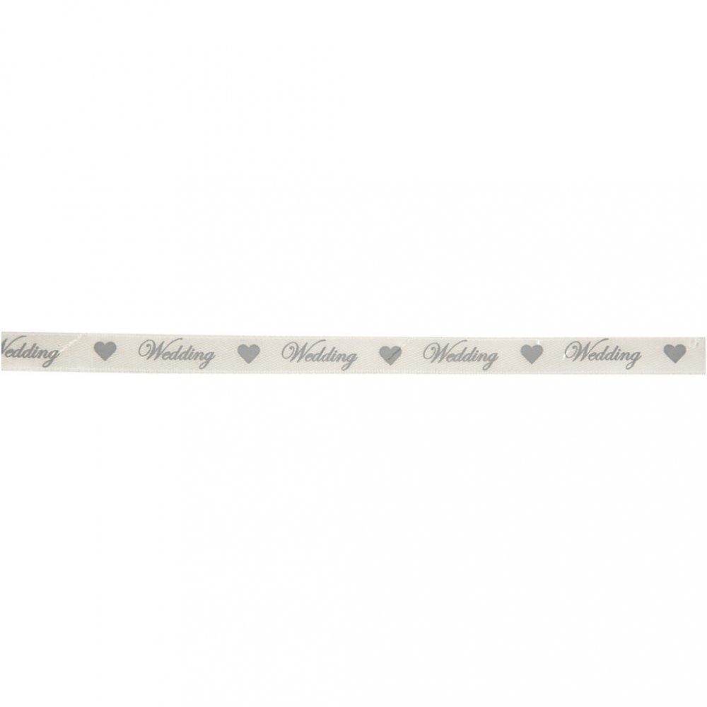 Kremhvitt satengbånd med trykk - Bryllup. Båndet er 1 cm bredt og 8 meter langt.