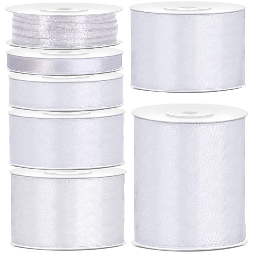 Hvitt satengbånd i forskjellige bredder - En rull består av 25 meter bånd.