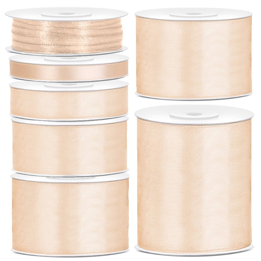 Satengbånd i kremhvitt i flere forskjellige bredder. En rull består av 25 meter tape.