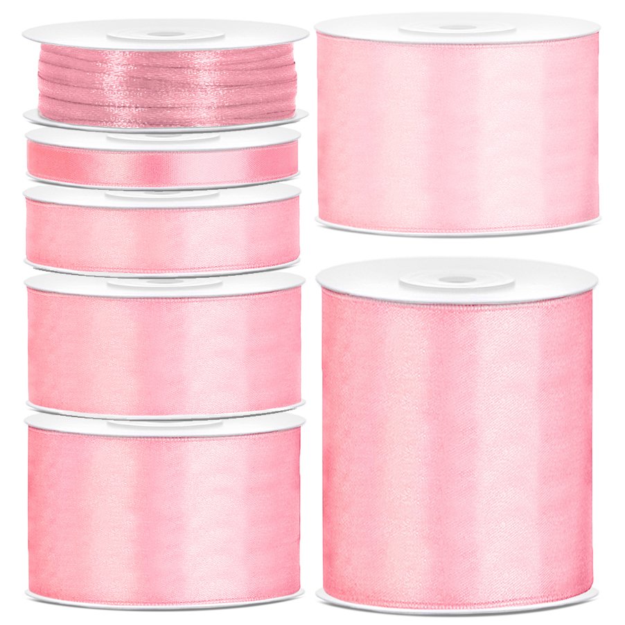 Satengbånd i lys rosa i flere forskjellige bredder. En rull består av 25 meter tape.