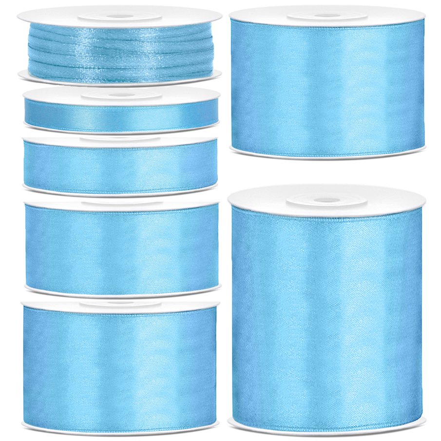 Satengbånd i lyseblått i flere forskjellige bredder. En rull består av 25 meter tape.