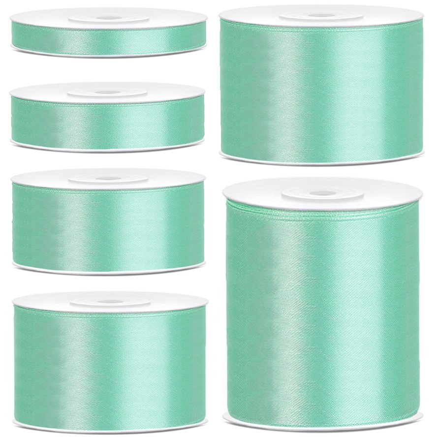 Satengbånd i mint i flere forskjellige bredder. En rull består av 25 meter tape.