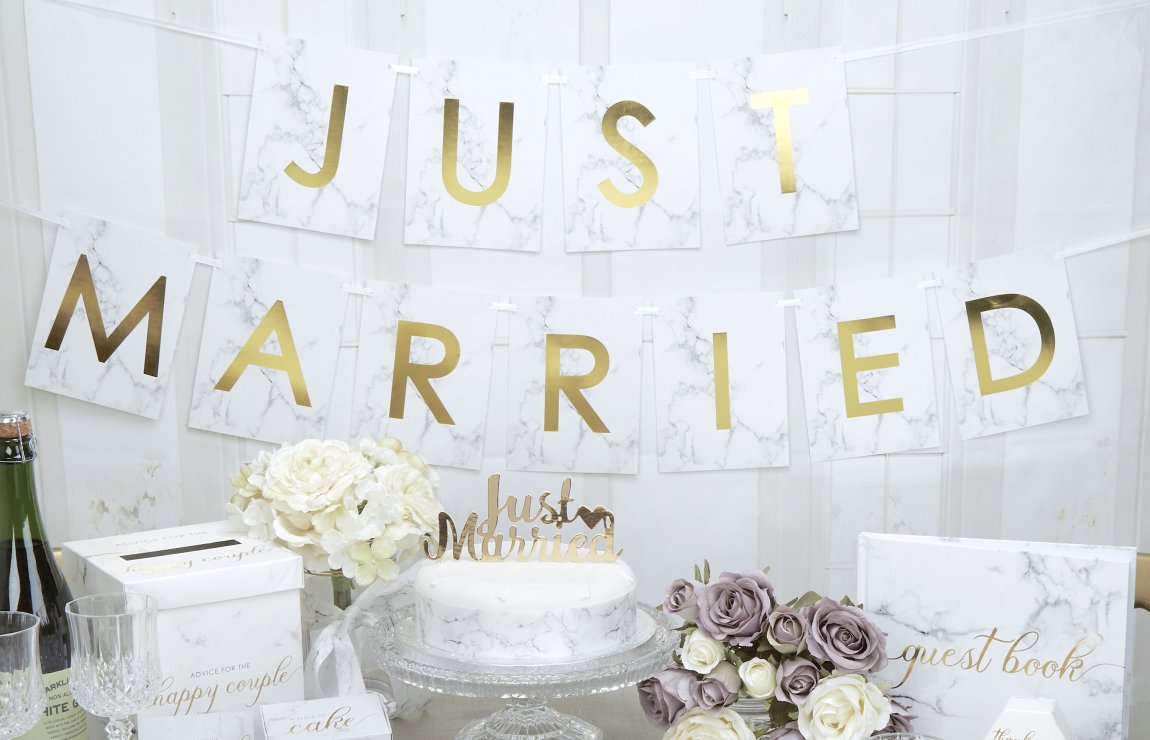 Nydelig vimpel til dessertbordet fra det populære bryllupstemaet «Scripted Marble» i marmor og gull.