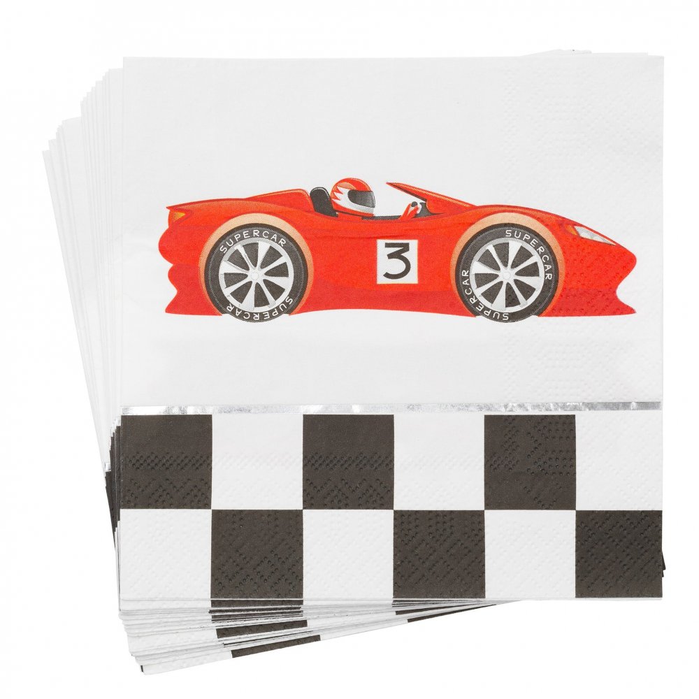Hvite servietter med racingtema - dekorert i rødt, sølv og svart, og utsmykket med detaljer som minner om en rask bil. Den skinnende sølvfolien gir serviettene en ekstra festlig følelse, noe som gjør dem til et stilig tillegg til festborddekningen.