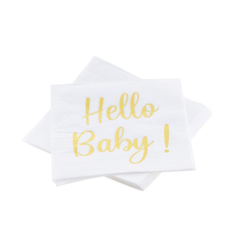 20-pakning servietter «Hello Baby» i gull. 3-lags, størrelse 33 x 33 cm