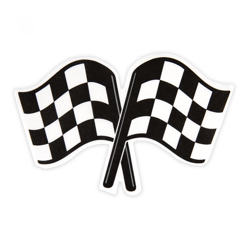 Servietter fra vårt Racing-tema formet som flagg med svart og hvit rutete overflate. Serviettene er omtrent 17,5 x 11 cm brettet og 33 x 24 cm utbrettet.
