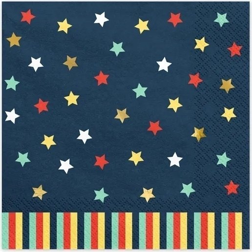 12-pakning med mørkeblå servietter med fargerike stjerner.