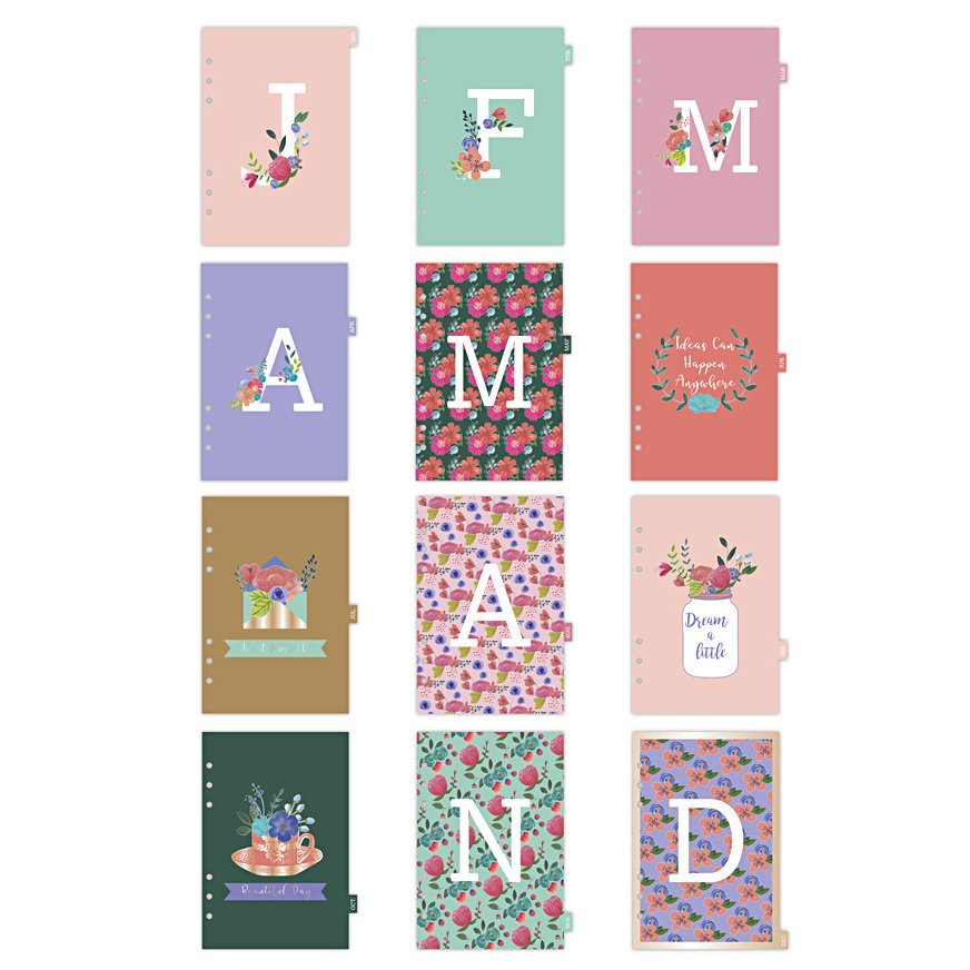12 dekorative og solide skillevegger i fine farger. Bokstavene står for alle årets måneder. Perfekt for punktskriving, reiser og kreativ journalføring.
