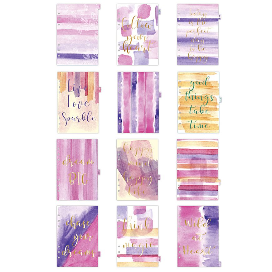 12 dekorative og solide skillevegger i fine farger. Bokstavene står for alle årets måneder. Perfekt for punktskriving, reiser og kreativ journalføring.