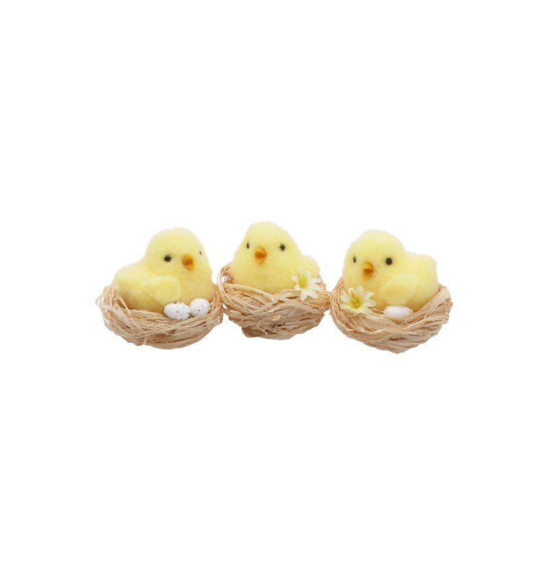 3 små søte kyllinger i små reir. Omtrent 3 cm høy. Søt som pynt til borddekningen eller buffeten i påsken.
