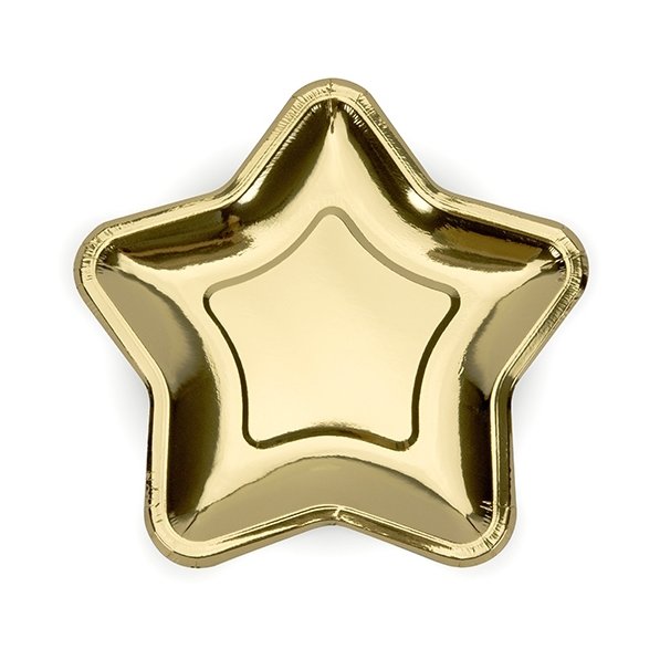 Pakke med 6 små stjerneformede papptallerkener i gull. Perfekt til kake, dessert, snacks eller festmat.