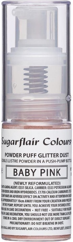 Den siste finishen på bakevarene dine! Denne glitrende pumpesprayen er enkel å bruke og perfekt for å dekorere cupcakes, kaker og mye mer. Gjør dette: Hold ca. 10 cm fra bakevarene dine og trykk ned på pumpen, gjenta til du oppnår ønsket effekt. For hver 1 kg kake og dekorasjon bør du ikke bruke mer enn 2 gram maling. Oppbevaring: Oppbevares i lukkede beholdere på et tørt sted. Produktet påvirkes ikke av normale temperaturvariasjoner. Ingredienser: antiklumpemidler (E551, E555), fargestoffer (E172, E170, E122*) *kan ha en negativ effekt på aktivitet og oppmerksomhet hos barn. Denne sprayen er luftdrevet og inneholder ikke alkohol.