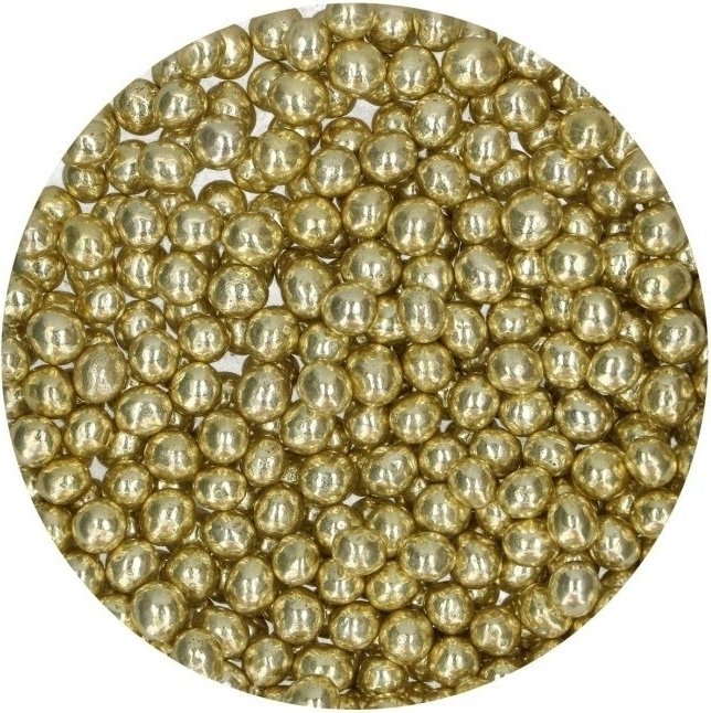 Nydelige gyldne sjokoladekuler med sprøsmak! Så fine å pynte cupcakes og kaker med! Ingredienser: sukker, melkesjokolade (sukker, melkepulver, kakaosmør (21 %), kakaomasse, emulgator (E322, soya), vaniljesmak), sprøsmak (rismel, hvetemel, sukker, hvetemaltmel, hvetegluten, salt, stabilisatorer (E414, E473), kakaosmør, gelatin (nøtt), fargestoff (E100, E160a, E174), glaseringsmiddel (E903, E904).