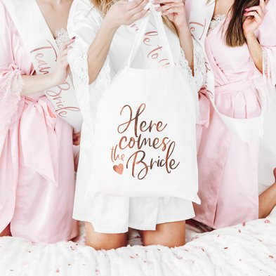 Superfin hvit veske i bomullsstoff med roségulltrykk - så morsom som gave til bruden på utdrikningslaget og perfekt til å pakke dagens nødvendigheter i.