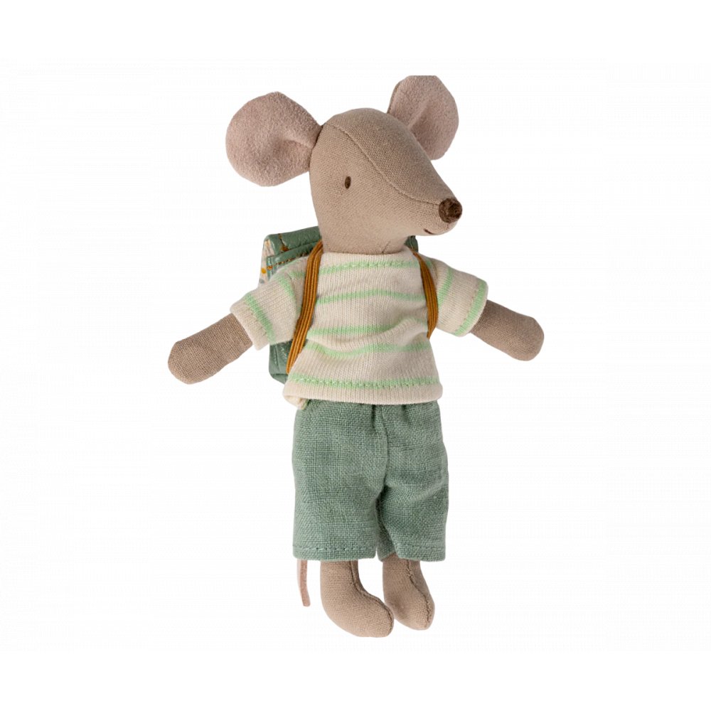 Lille storebror-mus kledd i shorts, kortermet skjorte og ryggsekk.