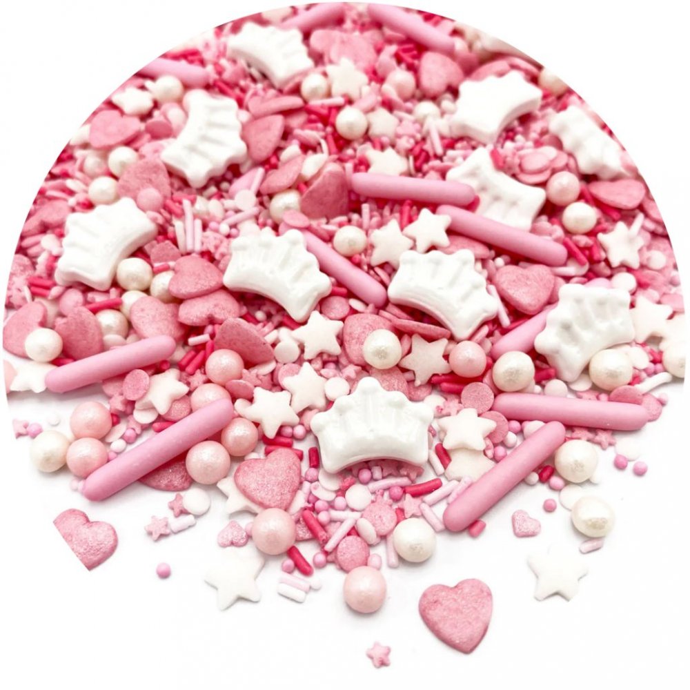 Supersøt prinsesse-tema strøsselmiks i forskjellige farger og former, små prinsessekroner, osv. Så fint til cupcakes, kaker og annet bakverk.