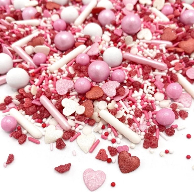 Nydelig strøsselmiks fra Happy Sprinkles, perfekt til å dekorere kaker, cupcakes og annet bakverk. Søte hjerter i hvitt, rosa og rødt kompletteres av sukkerperler i samme farger sammen med rosa sjokoladekuler og -pinner.