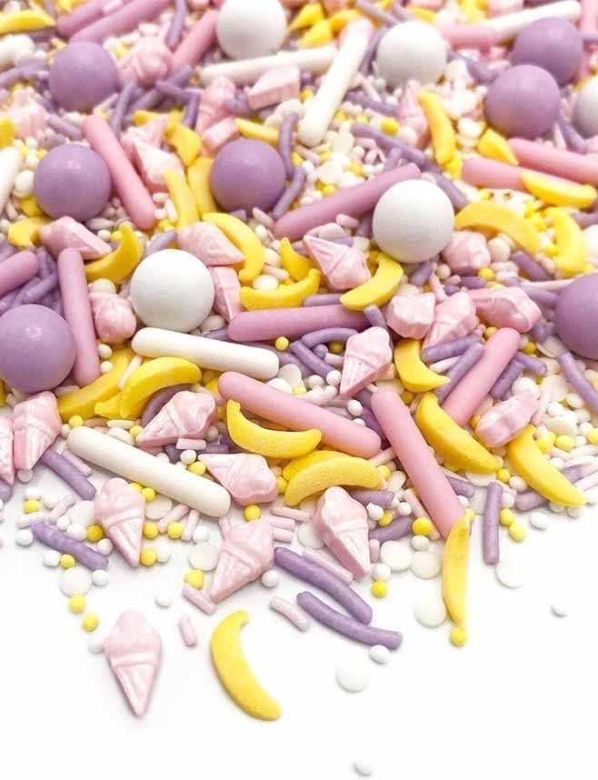 Fin pastellstrøsselmiks fra Happy Sprinkles, med små søte bananer og iskremkjeks! I fine vårfarger. Passer til bakverk, eller hvorfor ikke strø over en luksuriøs banansplit!