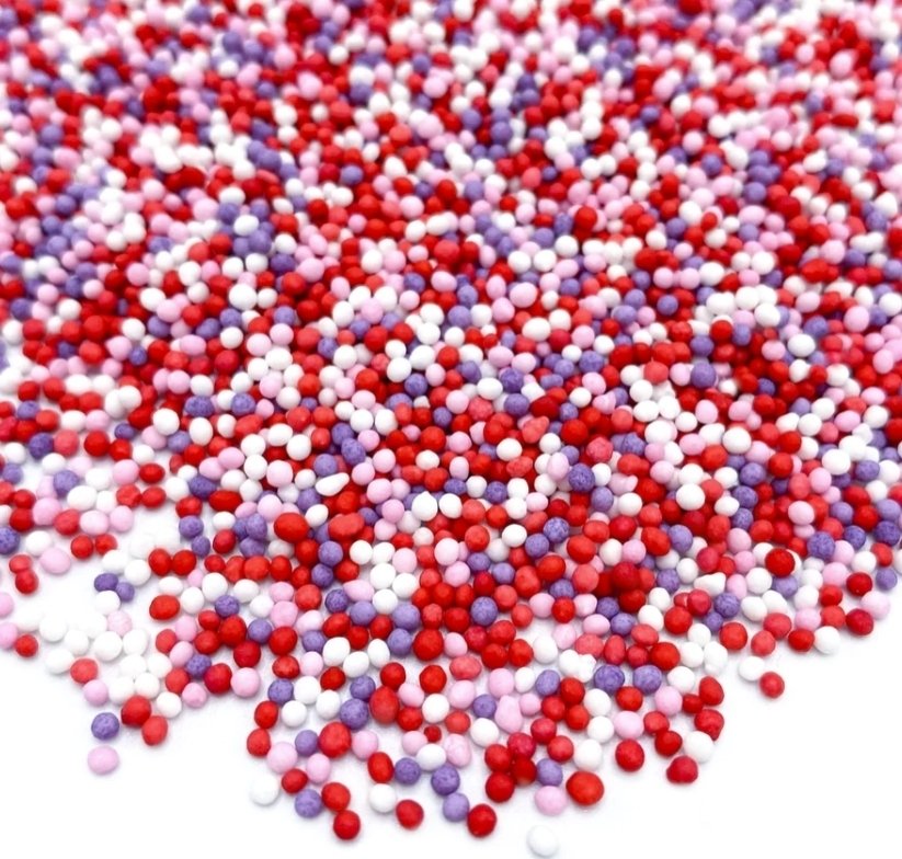 En flott strøsselmiks i form av små sukkerkuler (nonpareils) i rødt, rosa, hvitt og lilla. Perfekt til å strø over kaker og bakverk. Et litt uventet tips er å bruke dem på makroner - det blir virkelig pent!