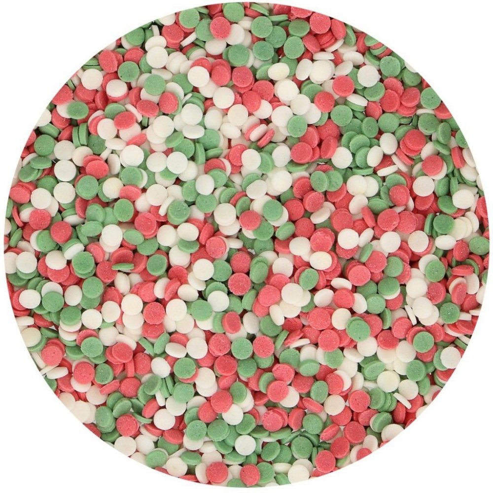 Nydelig strøssel formet som små sirkler i julefarger, omtrent 4 mm i diameter.
