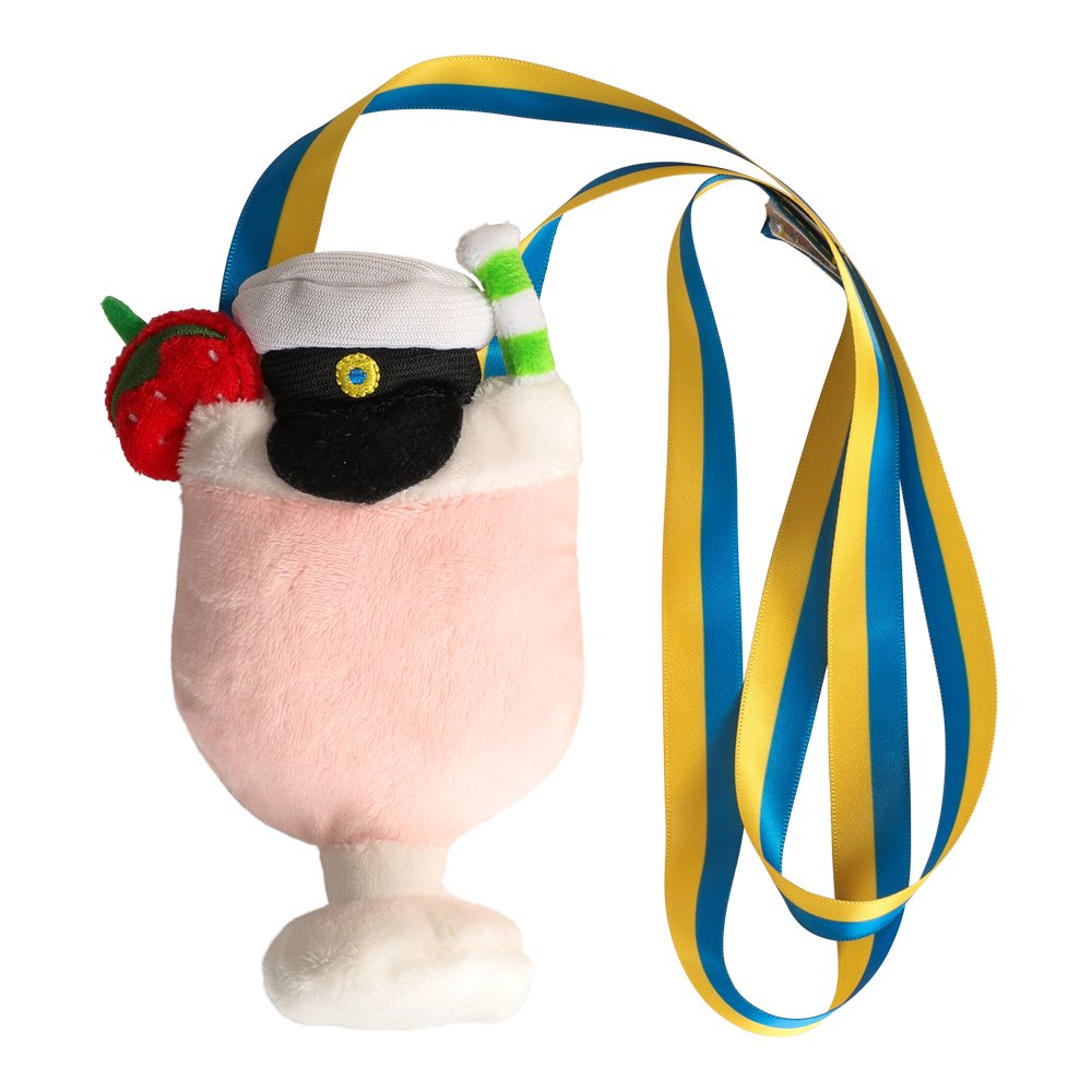 Supersøt studentanheng formet som en jordbærdrikk med studentlue og jordbær! Perfekt å henge rundt studentens hals med det blå/gule båndet.