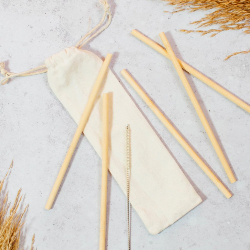 6-pakning med bambussugerør og en oppbevaringspose i bomull.